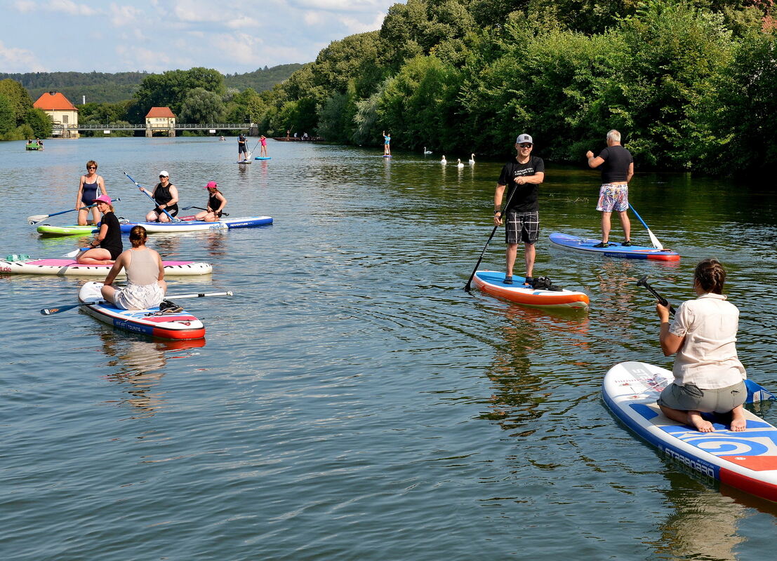 Zu Beginn etwas wackelig, aber dann immer sicherer, ging es einmal rund um die Neckarinsel. Die Stürze ins Wasser wurden bei dem heißen Wetter teilweise willentlich herbeigeführt und mit Humor genommen, nach der kalten, kurzen Schrecksekunde freuten sich die Badenden über die Abkühlung und paddelten tropfend weiter.