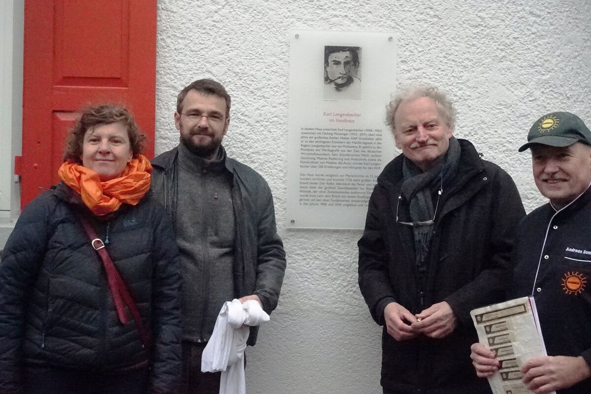 Christine Keck, Wolfgang Bauer, Christoph Dohse und Andreas Sommer (von links) vor der Gedenktafel zu Ehren Karl Langenbachers. FOTO: DÖRR