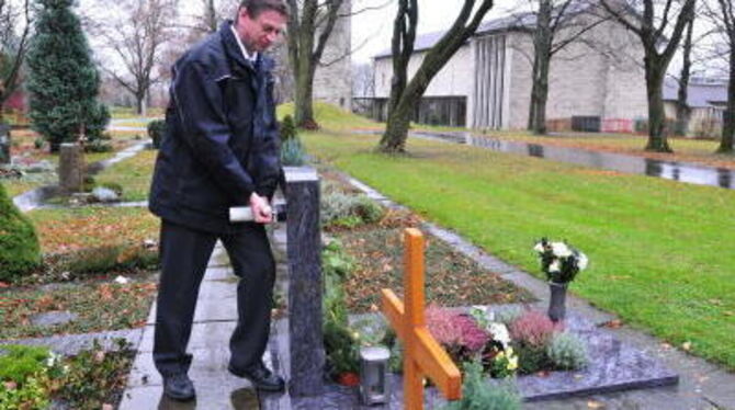 Wackelkandidat oder standfester Gedenkstein: Der Chef von Reutlingens Friedhöfen, Jürgen Senft, demonstriert wie Grabmale auf eventuelle Kippligkeit hin überprüft werden. Einmal jährlich unterziehen er und seine Mitarbeiter jeden einzelnen Grabstein eines solchen Druck-Tests. Alles in allem sind es in der Achalmstadt und ihren Bezirksgemeinden 1 700 Monumente, die untersucht werden müssen.