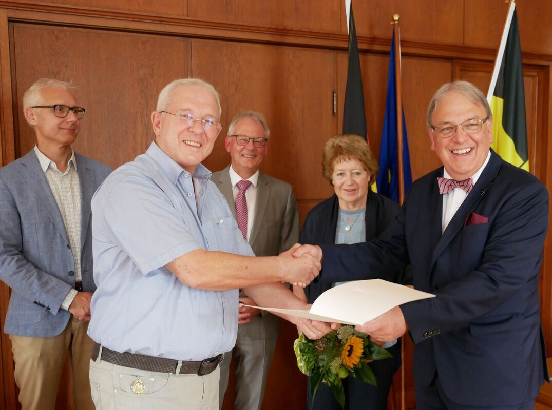 Zu seiner eigenen Überraschung erhielt Peter Reinhold (2. von links) am Mittwoch die Ehrennadel des Landes, mit dabei seine Frau Ursula Reinhold sowie Holger Grumann (links), Martin Rother (Dritter von links) und OB Thomas Keck (rechts).