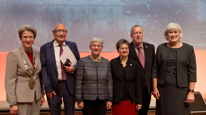 Barbara Bosch (links) zeichnete Jürgen Vocke, Jocelyne Renz, Ruth und Peter Fahrenholz und Ursula Schlüter mit der Verdienstmedaille der Stadt Reutlingen aus. FOTO: TRINKHAUS