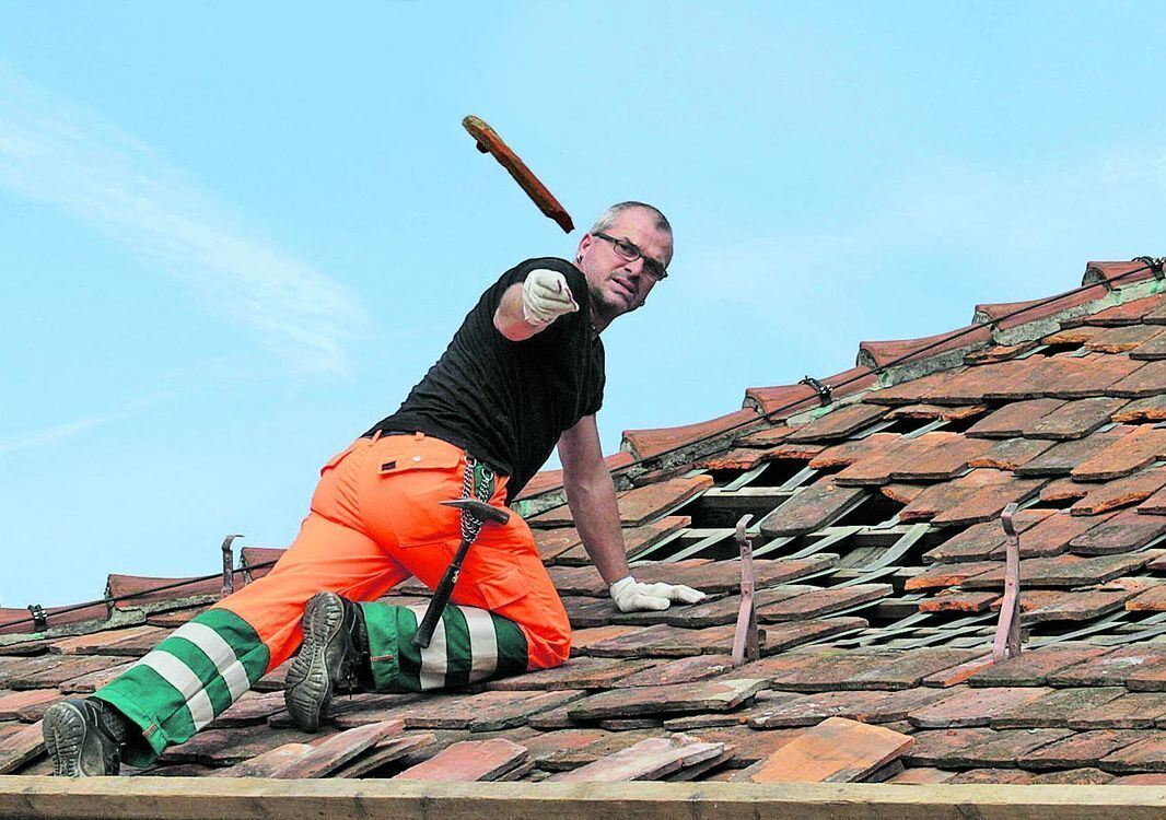 Manche Ziegel sind unrettbar vom Hagel zerschossen und fliegen in den Container. Hans-Martin Votteler vom Metzinger Bauhof bei der Arbeit auf der Kelter. GEA-FOTO: FINK