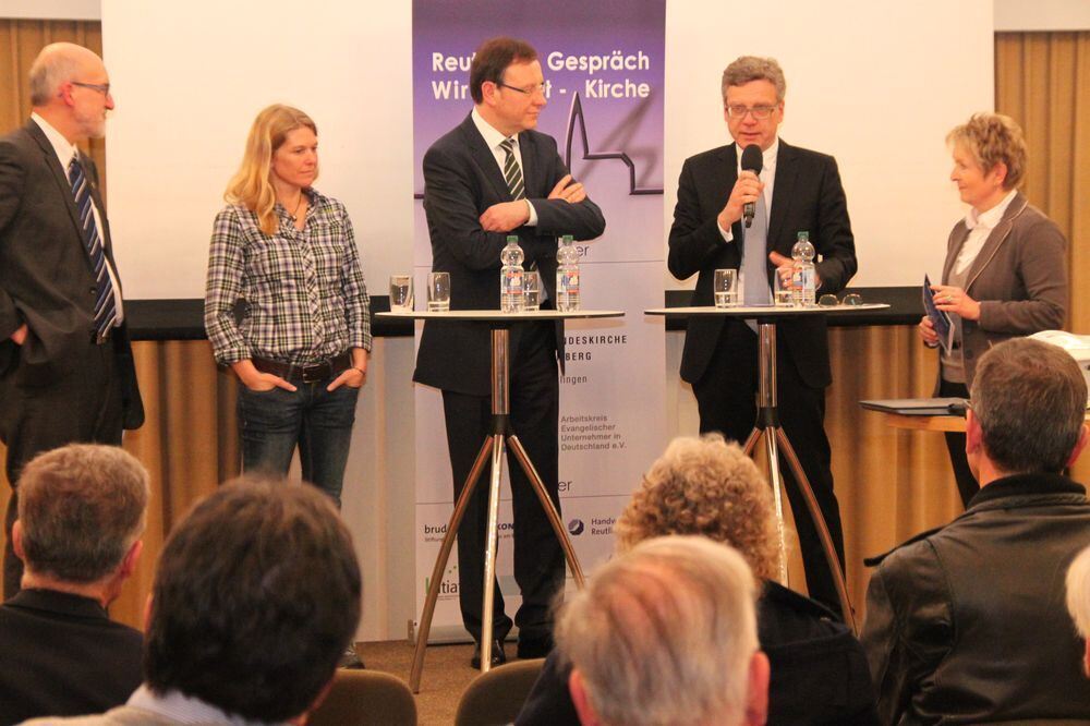 Diskutierten das Thema »Gemeinwohl-Ökonomie«: Prälat Dr. Christian Rose (von links), Vaude-Chefin Antje von Dewitz, Zollernalb-Sparkassen-Vorstand Claus Kimmerle, Finanzbürgermeister Alexander Kreher und Robert-Bosch-Personalchefin Ingrid Peters. FOTO: LEISTER