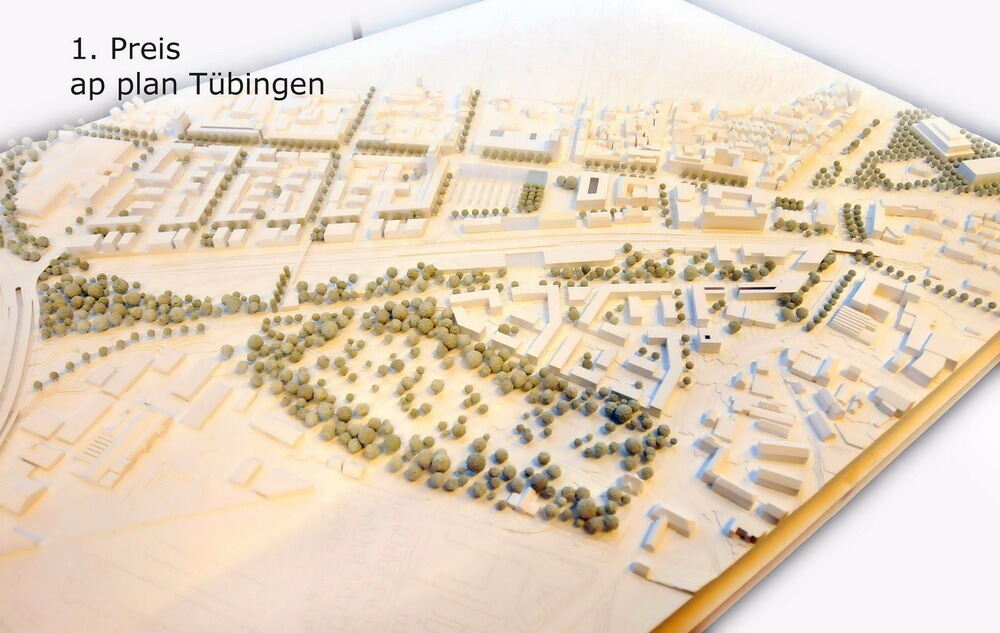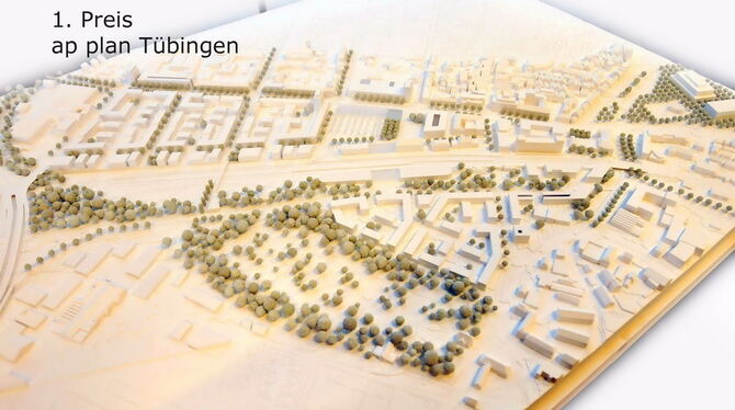 Der Entwurf der Arbeitsgemeinschaft »ag plan«, GRI und Kienle mit dem Listplatz samt angeschlossenem großen Omnibusbahnhof (rot markiert) und dem »Gleispark« links der Bahnlinie, der sich bis zur Echaz zieht.