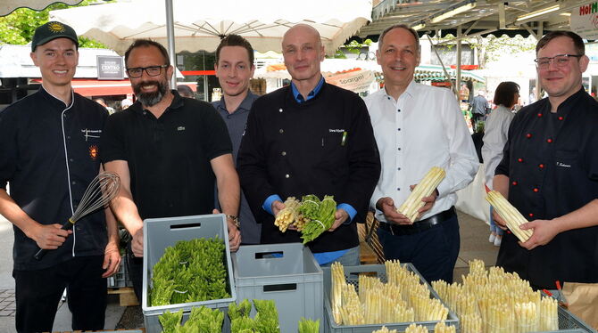 Spargel satt gibt es bei der Reutlinger Schlemmernacht. Sie promoten die Aktion (von links): Paul Sommer (»Café Sommer«), Uwe Grauer und Marcel Endris (»Joli«), Uwe Förster (»Culinarium«), Moritz Neubert (RGI), Till Scheurer (»Gerberstüble«). FOTO: NIETHAMMER