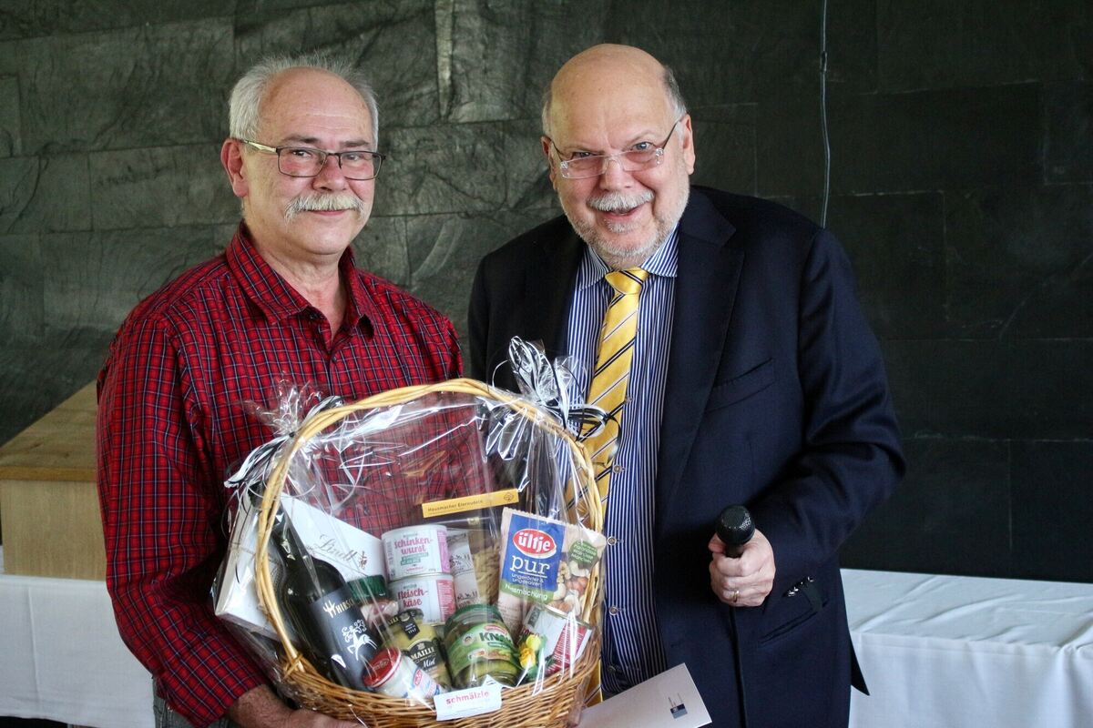 Beim Zustellertreffen des GEA erhielt Gerd Stirmlinger von Verleger Valdo Lehari jr. (rechts) eine Auszeichnung für seine 25-jährige Tätigkeit als GEA-Zusteller.