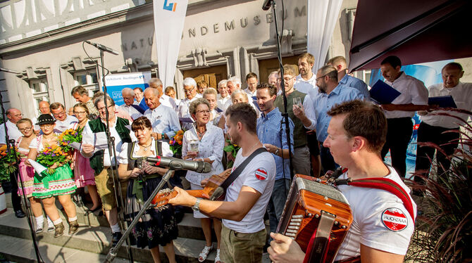 Zur Weindorferöffnung 2018 mit Oberbürgermeisterin Barbara Bosch und Organisatorin Regine Vohrer (vorne Mitte), dem vereinigten Männerchor und den Wirtefamilien wurde das Weindorflied angestimmt. FOTO: TRINKHAUS