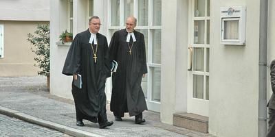 Landesbischof July (links) mit »Bruder Rose«, dem neuen Reutlinger Prälaten, auf dem Weg von der Marienkirche ins Matthäus-Alber-Haus.