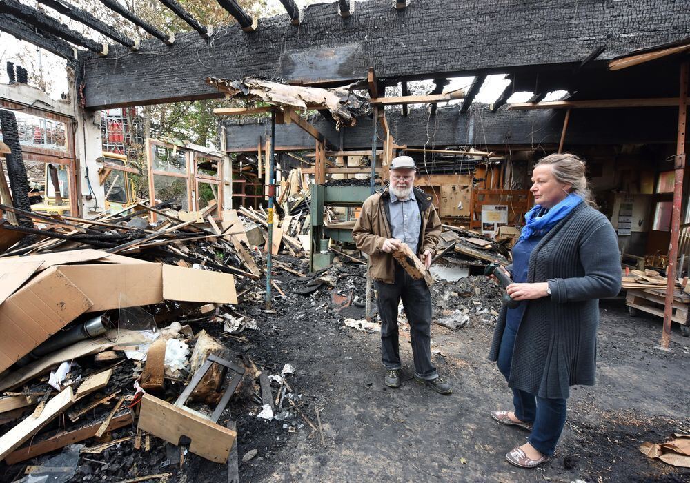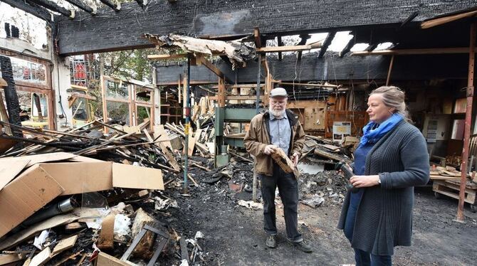 Die Trümmer vor Augen, den Neuanfang auch: Johannes Wurster und seine Frau Gisela stehen in ihrer ausgebrannten Schreinerei und überlegen, wie es weitergeht.