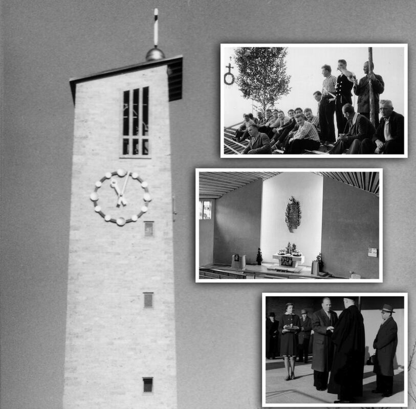 Am 7. Februar 1960 wurde die Johanneskirche eingeweiht. Die kleinen Fotos zeigen von oben nach unten: das Richtfest im Juni 1959, die Altarwand mit dem Abendmahl von Ulrich Henn sowie die Schlüsselübergabe. FOTOMONTAGE: ELS