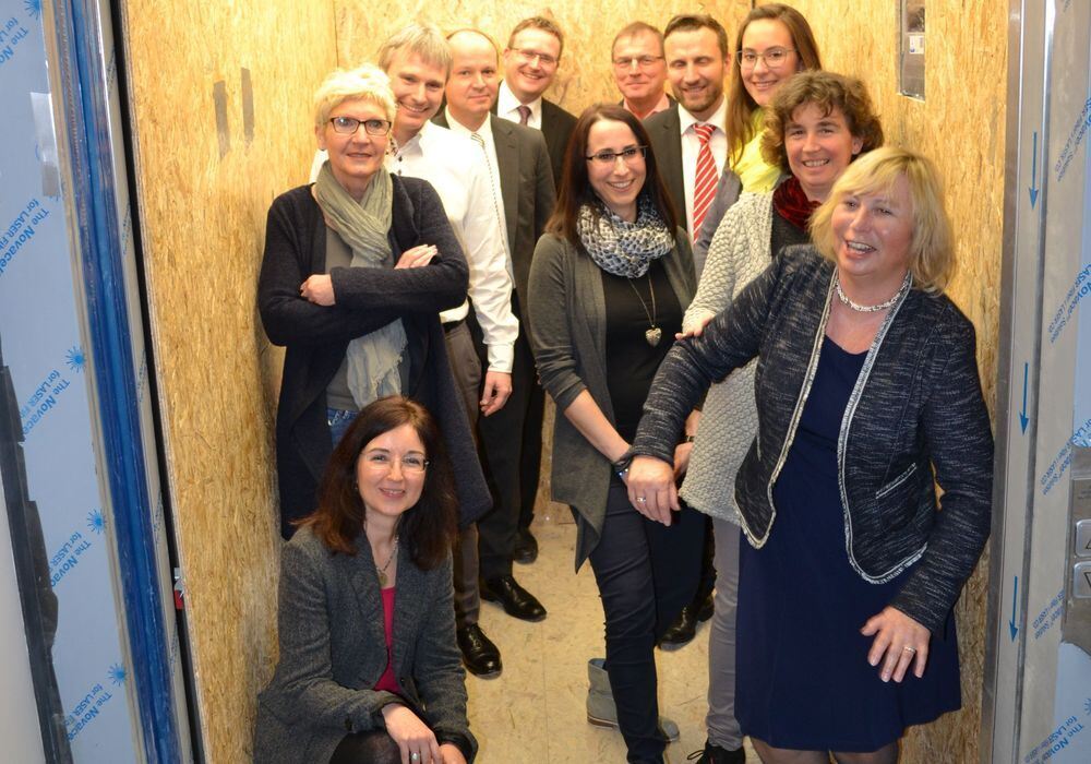 Nächster Halt Gründermesse: Die Veranstalter formieren sich im noch unfertigen Neubau des Technologieparks zum etwas anderen Elevator-Pitch im Aufzug.