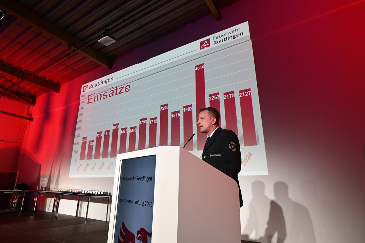 Feuerwehrkommandant Stefan Hermann wirft Zahlen auf die Leinwand, hinter denen gerettete Leben, gelöschte Brände oder bewältigte Unwetter stehen.