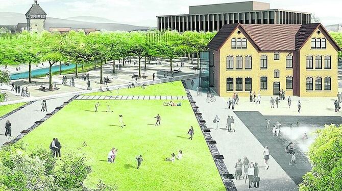 Mit einer großen Rasenfläche und einem Wasser-/Nebelspiel, dessen Lage sich gegenüber dieser Computerskizze noch ändern kann, soll der Kulturplatz beim historischen Krankenhäusle zum Anziehungspunkt im sogenannten Bürgerpark werden. GRAFIK: KIENLE-PLAN