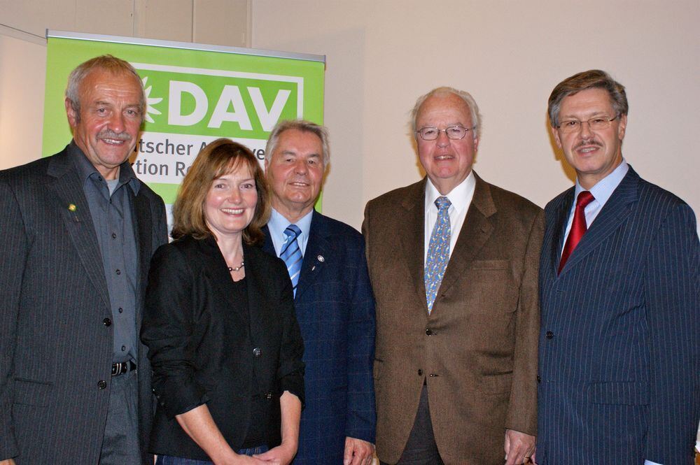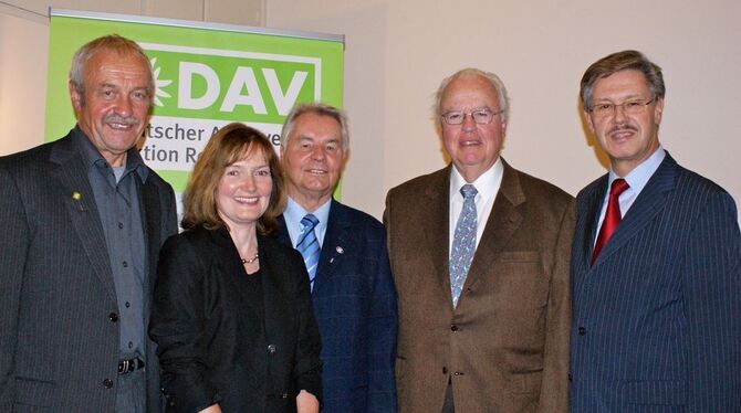 Geehrte und Ehrende (von links): Helmut Kober (Vorsitzender DAV Sektion Reutlingen), Ingrid Schulz (stellvertretende Vorsitzende), der mit der Landesehrennadel ausgezeichnete Vorstand und Schatzmeister Dieter Pasternacki, Ehrenmitglied Karl Heinz Danzer und Staatssekretär Dieter Hillebrand.
