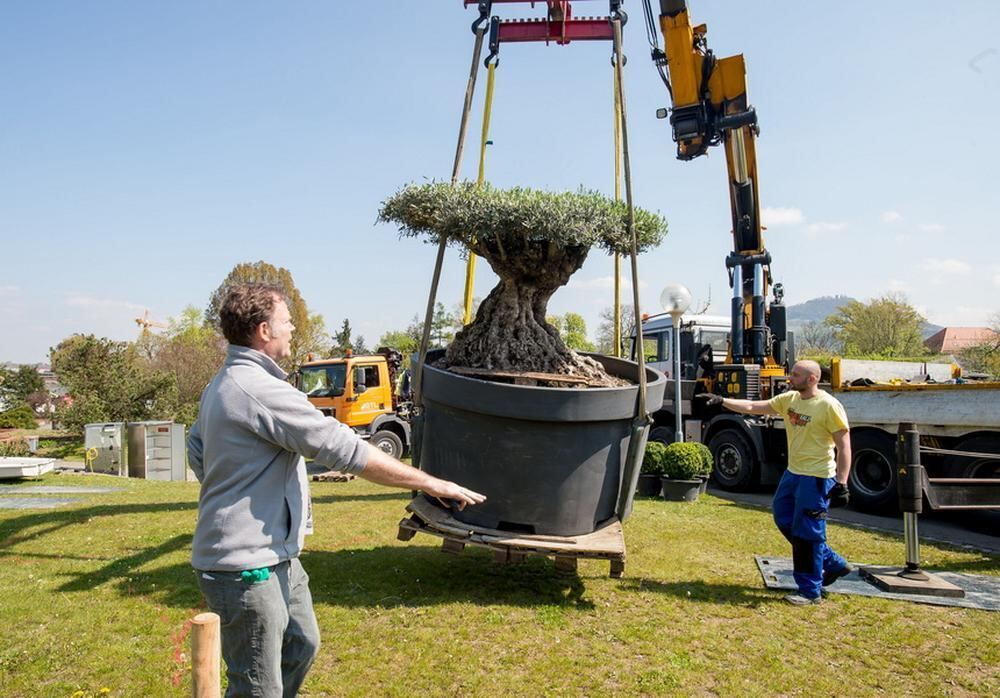 Da soll er hin: Der vier Tonnen schwere Olivenbaum steht während der Garden Life im Schaugarten der Stadt Lindau.