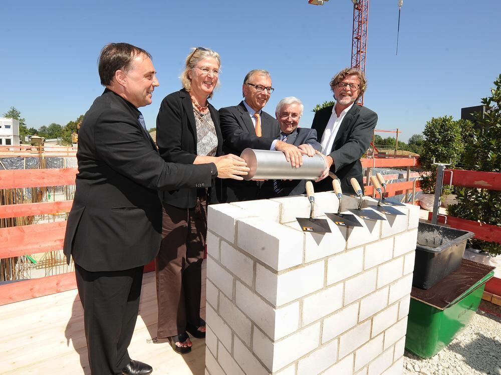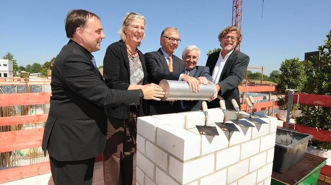 Grundsteinlegung für den vierten TTR-Neubau in Mark-West (von links): Geschäftsführer Thomas Depphof, Baubürgermeisterin Ulrike Hotz, L-Bank-Vorstandsmitglied Dr. Karl Epple, Rainer Alber (Rommel GmbH) und Architekt Professor Gerd Ackermann. GEA-FOTO: PACHER