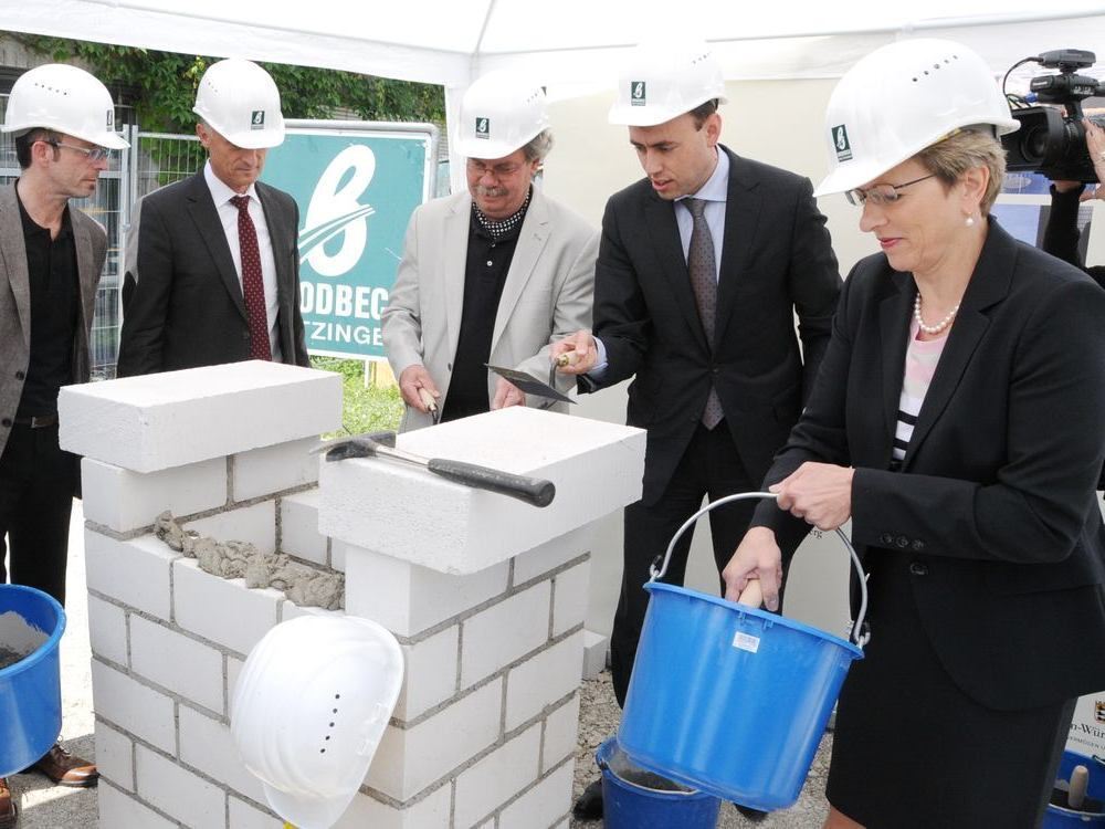 Maurer bei der Arbeit (von links): Annette Ipach-Öhmann und Jürgen Robert Klein (beide Vermögen und Bau Baden-Württemberg), Hochschul-Präsident Hendrik Brumme, Bernd Selbmann (Vermögen und Bau Baden-Württemberg), Minister Nils Schmid und Oberbürgermeisterin Barbara Bosch bewiesen bei der Grundsteinlegung handwerkliche Fähigkeiten.