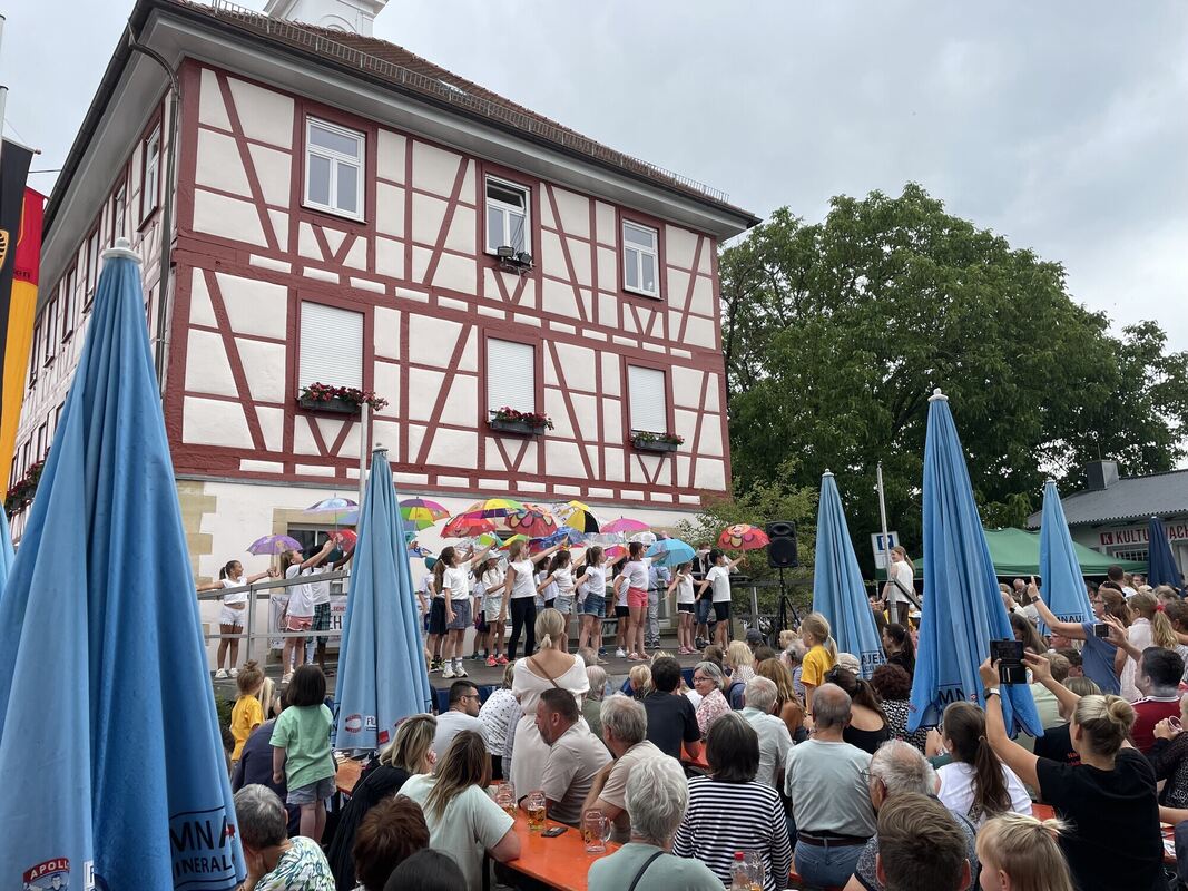 Die Schüler spannten die Schirme nicht für das Wetter, sondern für ihre Tanzaufführung, auf.