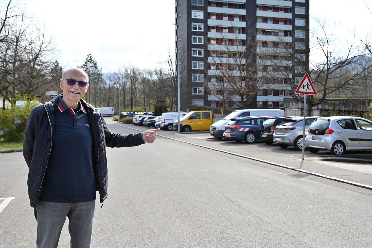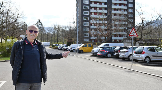 Hier dürfen demnächst nur noch die Autos von Eigentümern stehen: Armin Rauscher zeigt die bisher noch frei nutzbaren GWG-Parkplätze. FOTO: PIETH