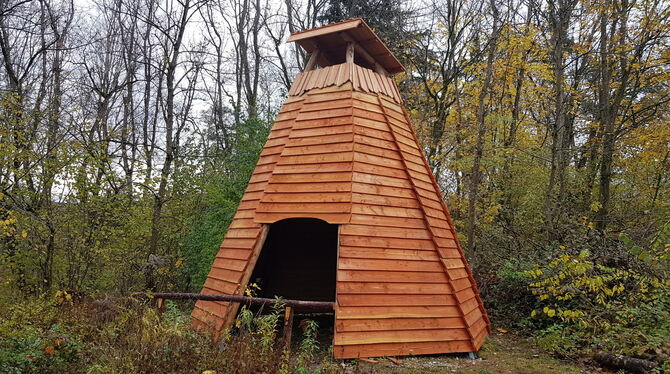 REUTLINGEN. Knapp 200 Arbeitsstunden und 10.000 Euro stecken in einem hölzernen Tipi, das binnen der zurückliegenden Wochen auf dem Jugendzeltplatz des Umweltbildungszentrums Listhof errichtet wurde. Konstruiert und aufgestellt haben es Auszubildende des Reutlinger Forsthofs, der – wie bei einem Pressegespräch zu hören – dem Umweltbildungszentrum seit jeher eng verbunden ist. Das Tipi soll unter anderem Schulklassen beim Open-Air-Naturkundeunterricht vor Wind und Wetter schützen – aber an heißen Sommertagen auch vor praller Sonne. Und zeltenden Jugendlichen soll es künftig als überdachte Grillstelle dienen; nämlich dann, wenn im Innern des etwa 6,5 Meter hohen Massiv-Zeltes Bänke und eine Feuerschale installiert sind.