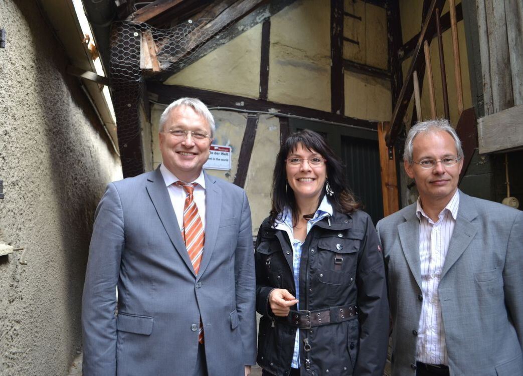 Verkündeten die frohe Botschaft von der Rettung der Spreuerhofstraße (von links): Robert Hahn, Tanja Ulmer und Dr. Christoph-Michael Pfefferle. Das sichernde Drahtnetz an der Dachkante des Hauses Nummer 9 kommt dann auch endlich weg. FOTO: ANTZ