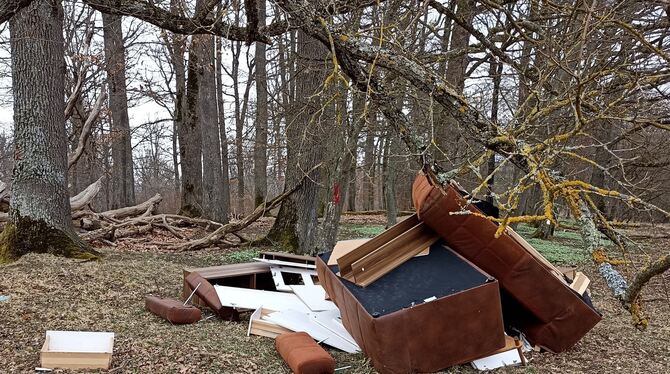 REUTLINGEN-BETZINGEN. Beate Budnik wollte ihren Augen nicht trauen, als sie kürzlich zu einem Spaziergang im Wald bei Betzingen unterwegs war. Zwischen den Bäumen sah sie alte Wohnzimmermöbel, die ganz offensichtlich jemand einfach dort entsorgt hatte. Empört darüber, machte sie Fotos vom Sperrmüll und schickte eins an den GEA. Zusammen mit einem Leserbrief, in dem sie unter anderem schrieb: »Da liegen jetzt Spiegel, Sofateile, Schrankwände, Schubladen inmitten von geschützter Natur.«