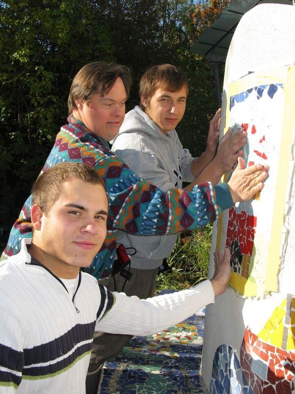 Nico Neuenfeld, Martin Brauer und Alexander Benedovski bringen ein Fliesen-Mosaik an der Terrasse des Kaffeehäusles an.
