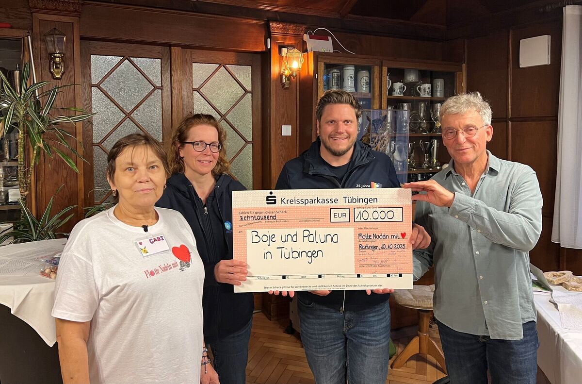 Gabriele Hoyh (links) überreicht den Spendenscheck über 10.000 Euro an Dr. Katharina Riebe und Philipp Nährig von Paluna und Oscar Schmid-Schwämmle von BOJE Tübingen.
