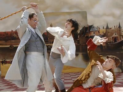 Hauptmann Armand wahrhaft wehrhaft: Er (Gianni Meurer) wirft sich zwischen Diener Philippe (Michael Schneider, rechts) und den drohenden Kaufmann van Haarlem (Carl-Herbert Braun).