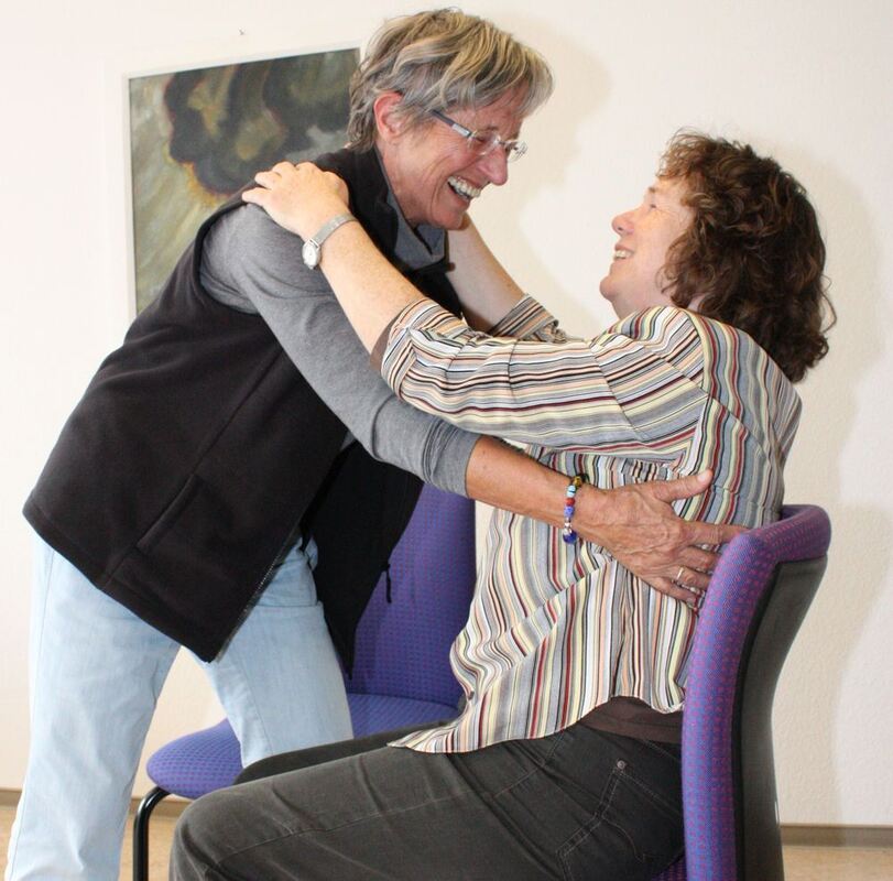 Barbara Haas (links) und Margot Sackmann üben das Umsitzen. Damit die Bewegung nach kinästhetischen Prinzipien der Harmonie beim Tanz ähneln kann, müssen sich beide Partner darauf einlassen.