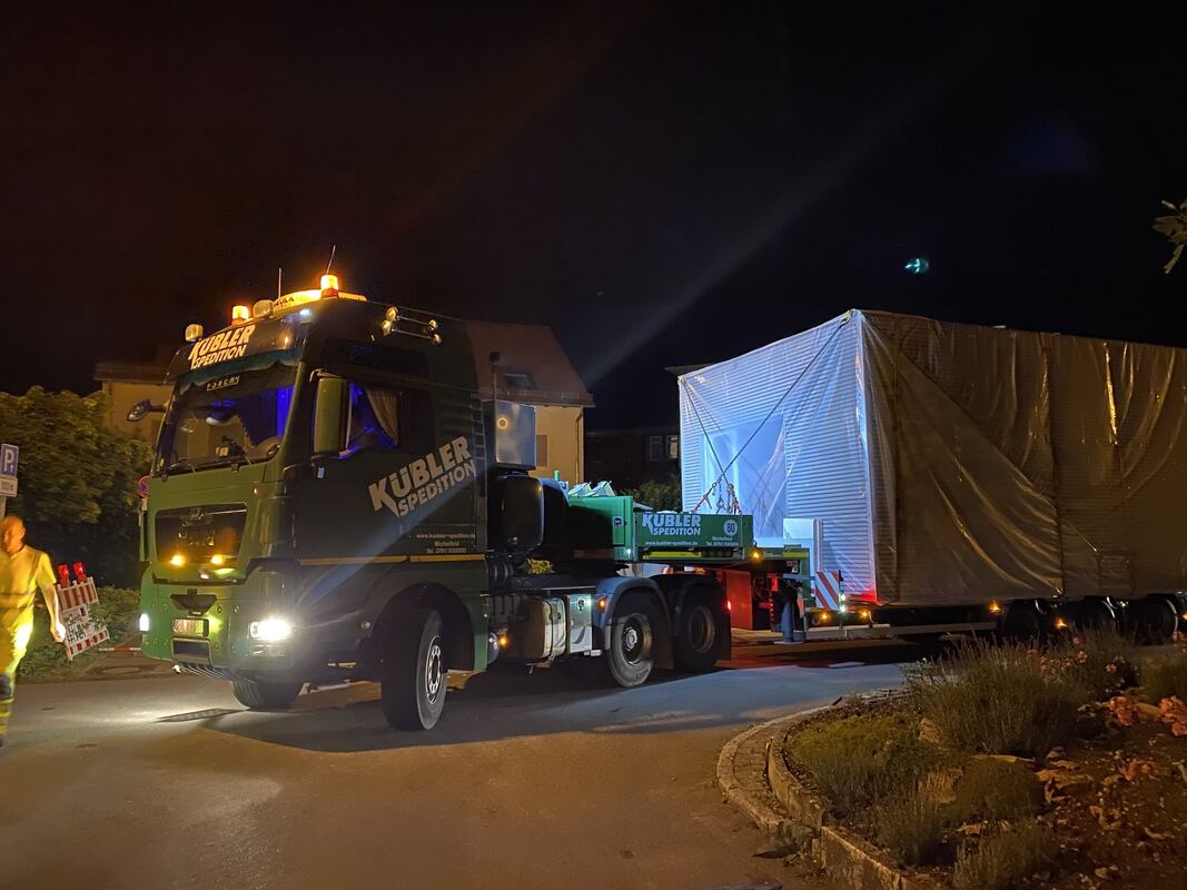 REUTLINGEN-BETZINGEN. Großes Kino für ein kleines Haus: Ein »Flying Space« machte sich in der Nacht auf Freitag auf die Reise vom Fertighaushersteller Schwörer in Hohenstein-Oberstetten in seine neue Heimat Betzingen, wo es ans Büro von Architekt Jochen Schmid von Hartmaier+ Partner »angedockt« werden sollte. Weil das 13 Tonnen schwere Modulhaus 4,50 Meter breit ist, brauchte es eine Sondergenehmigung, Polizeieskorte und die volle Fahrbahn noch dazu, weshalb seit Wochenbeginn in halb Betzingen Parkverbotsschilder für den Tag der Anlieferung aufgestellt worden waren.