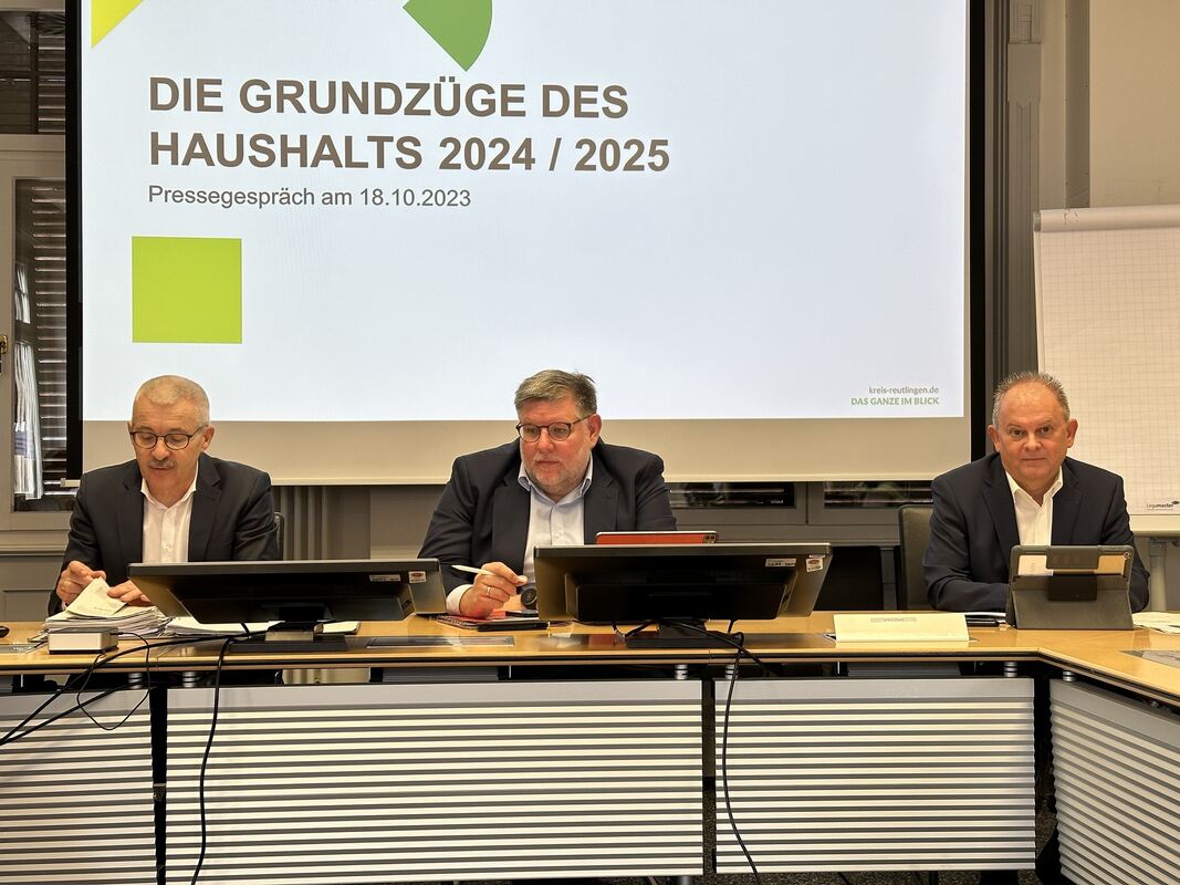 Bei der Vorstellung des Entwurfes für den Doppelhaushalt 2024/25 des Landkreises Reutlingen haben (von links) Kreiskämmerer Wolfgang Klett, Landrat Dr. Ulrich Fiedler und Verwaltungsdezernent Gerd Pflumm ernste Gesichter.