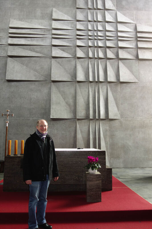 Pfarrer Matthias Dangel vor dem Relief-Kreuz in der Heilig-Geist-Kirche. FOTO: BÖHM