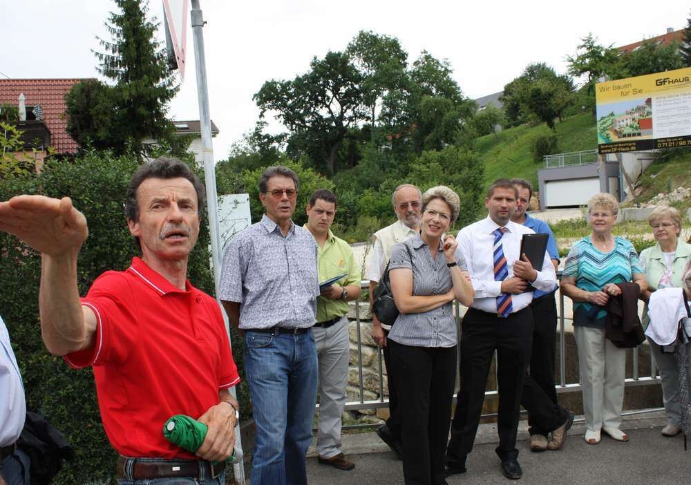 Oberbürgermeisterin Barbara Bosch (Mitte, daneben Bezirksbürgermeister Frank Hofacker) war bei ihrem Besuch in Altenburg ganz Ohr. Ortschaftsrat Günther Brändle (vorn) erläuterte die Verkehrsproblematik in der Donaustraße.
