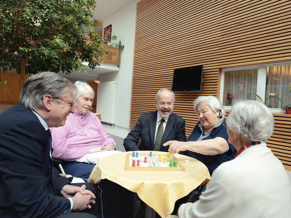 So entspannt geht’s sonst nicht zu, wenn die Heimaufsicht kommt. Fürs Pressefoto spielten Hermann Strampfer (links) und Thomas Reumann mit Bewohnerinnen des Seniorenzentrums Mensch-Ärgere-Dich-Nicht. Zuvor waren sie bei einer Routine-Kontrolle dabei.