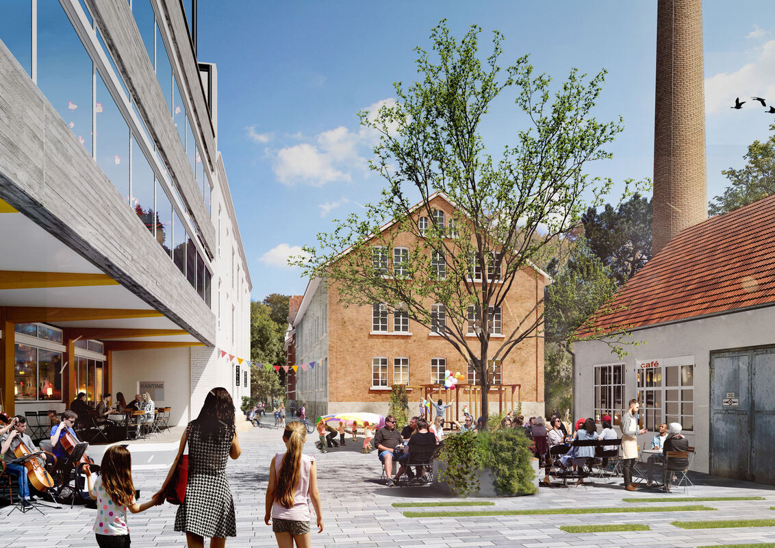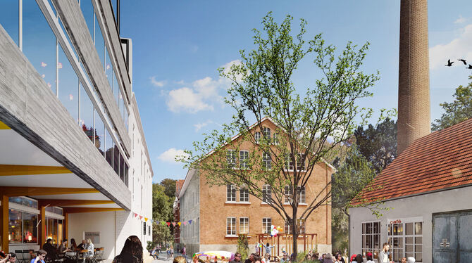So soll das Herzstück des Heinzelmann-Areals aussehen: Ein Quartiersplatz beim denkmalgeschützten Schornstein.