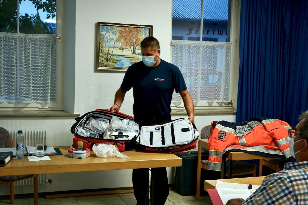 Paco Lieb zeigte den Bezirksgemeinderäten die Ausstattung des Notfallrucksacks, den die Helfer vor Ort bei sich haben.