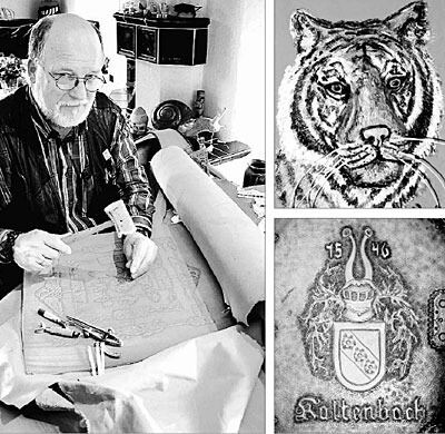 Kunst in Leder: Herbert Hübner bei der Arbeit, ein plastischer und kolorierter Tigerkopf, ein Familienwappen.
