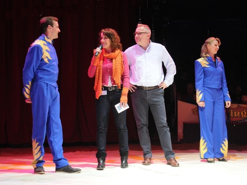 5 030 Euro Spendengelder kamen bei der Benefiz-Vorstellung des Weihnachtscircus zusammen. Iris Goldack vom GEA-Marketing und Klinikchef Peter Freisinger, flankiert vom Zirkusdirektorenpaar Michael und Andrea Sperlich, verkünden die frohe Botschaft. Foto: Jürgen Meyer