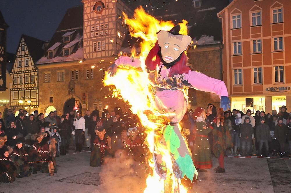 Symbol für das Ende der Fasnet: Ein Schandelekostüm (aus Papier) verbrennt vor dem Spitalhof.