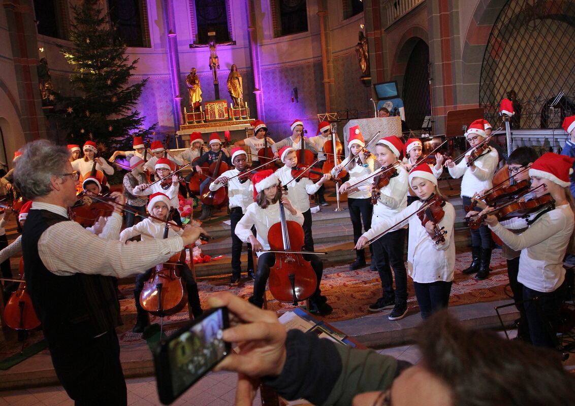Mit ihrer Musik und roten Mützen verzauberte die Fünfer-Streicherklasse unter der Leitung von Wolfhard Witte die Zuhörer. FOTO: KOZJEK