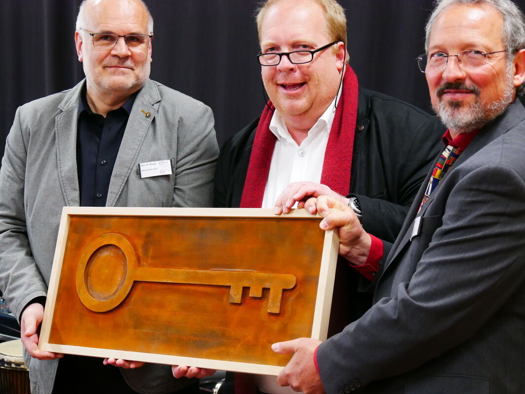 Bei der Schlüsselübergabe: (von links) Rainer Kluza, Geschäftsführer der Gemeindepsychiatrie, Architekt Jochen Schmid und Professor Gerhard Längle, Klinik-Geschäftsführer. FOTO: LEISTER