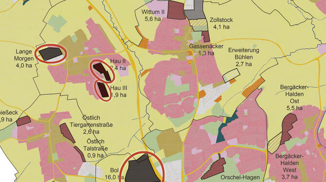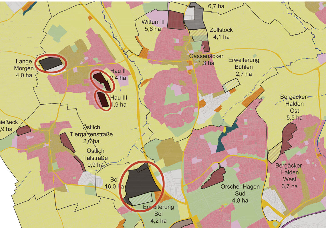 Rot eingekreist sind die Flächen, um die es im Flächennutzungsplan gehen soll. Vor allem das Gebiet »Bol« lässt die Sickenhäuser Gemeinderäte diskutieren. FOTO: STADT/REPRO