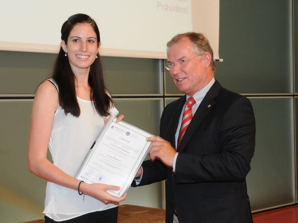 Lions Präsident Reinhard Detzel vergab das Go-out-Stipendium an Franziska Herrmann. GEA-FOTO: MEYER