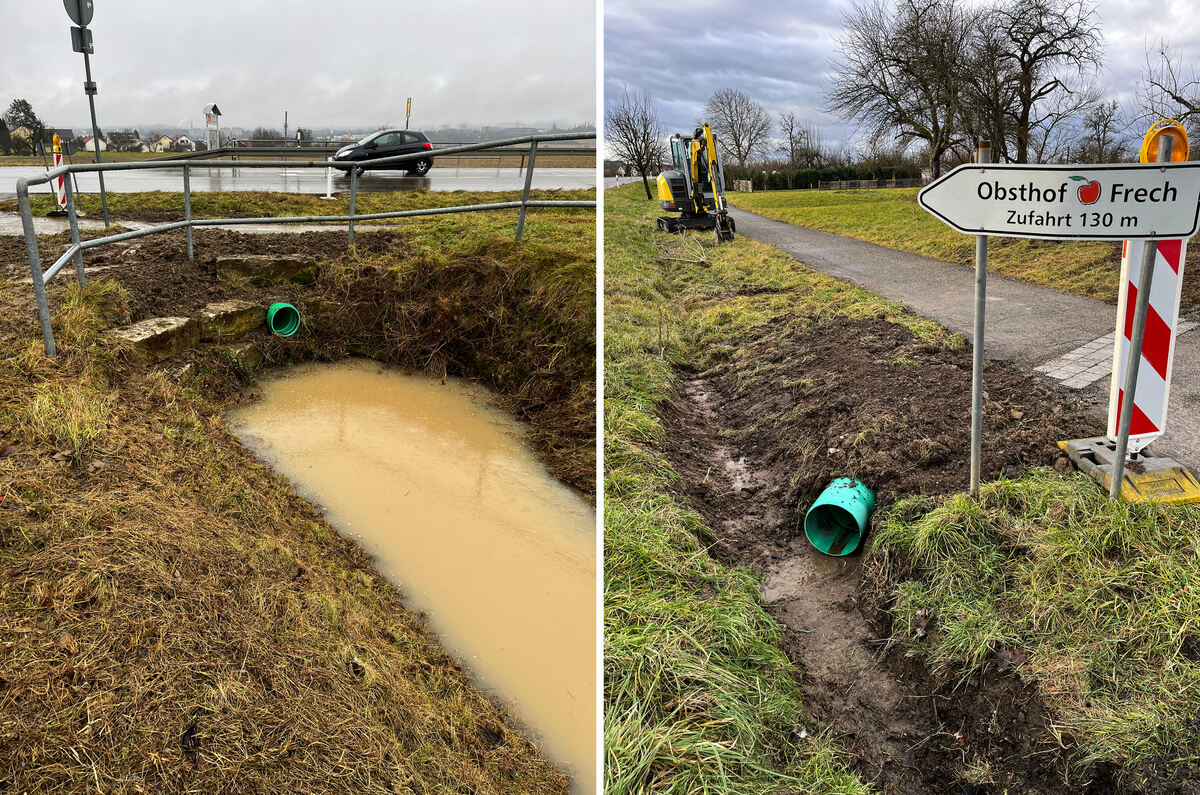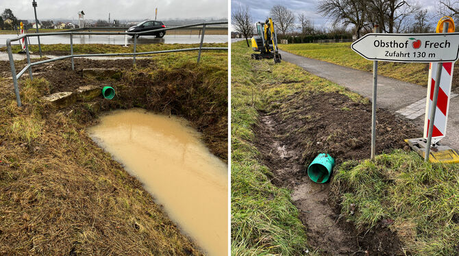 Immerhin das ist geschafft: Vom halbfertigen Graben (links) führt nun ein Rohr in den Kanal, eine gewisse Wassermenge kann also abfließen, ohne dass die Feuerwehr mit Pumpen nachhelfen muss.