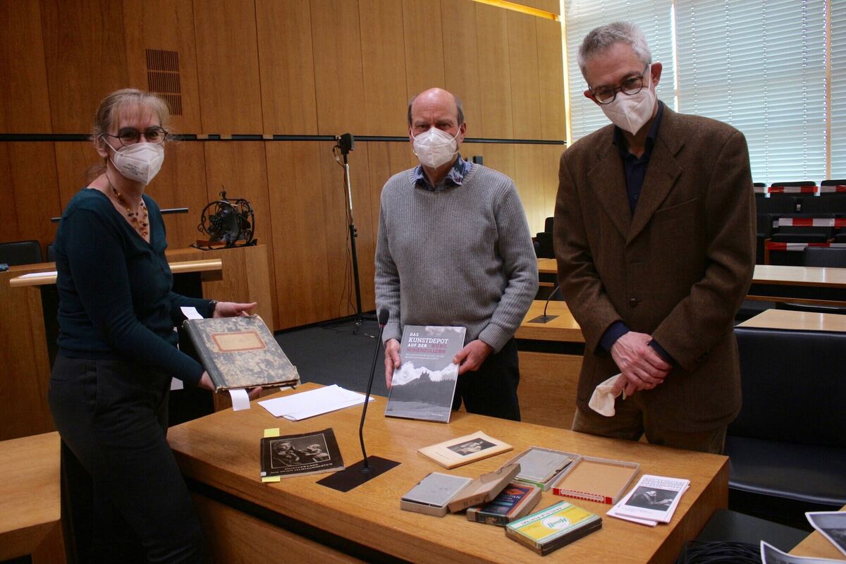Reutlingens Kulturamtsleiterin Anke Bächtiger, Buchautor Volker Lässing und Archivleiter Dr. Roland Deigendesch (von links) stellten Carl Nähers Glasplatten-Fotografien beim Pressetermin im Rathaus vor.