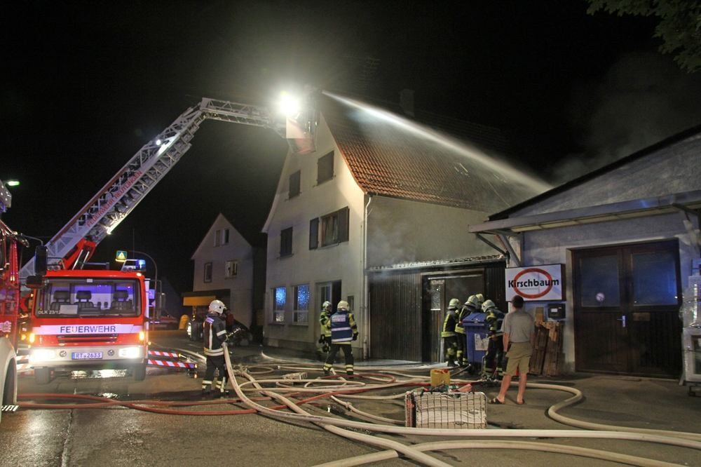 Der Brand drohte auf der einen Seite auf das angebaute Wohnhaus und auf der anderen Seite auf den Schreinereikomplex der Firma überzugreifen. FOTO: Feuerwehr Reutlingen