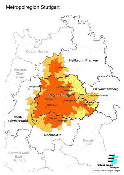 Metropolregion Stuttgart: Neben den Stuttgarter Nachbarkreisen sind die Landkreise Heilbronn, Göppingen, Reutlingen und Tübingen vertreten.