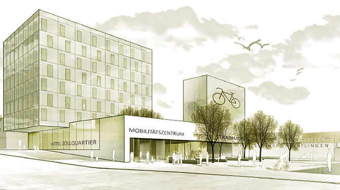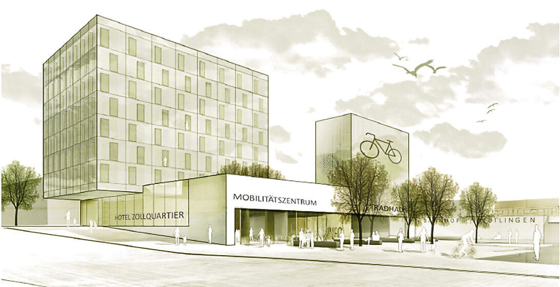 Neues Hotel in der Burkhardt+Weber-Straße mit »Mobilitätszentrum«. Rechts der Bahnhof, dazwischen die Gleisanlagen. GRAFIK: REPRO