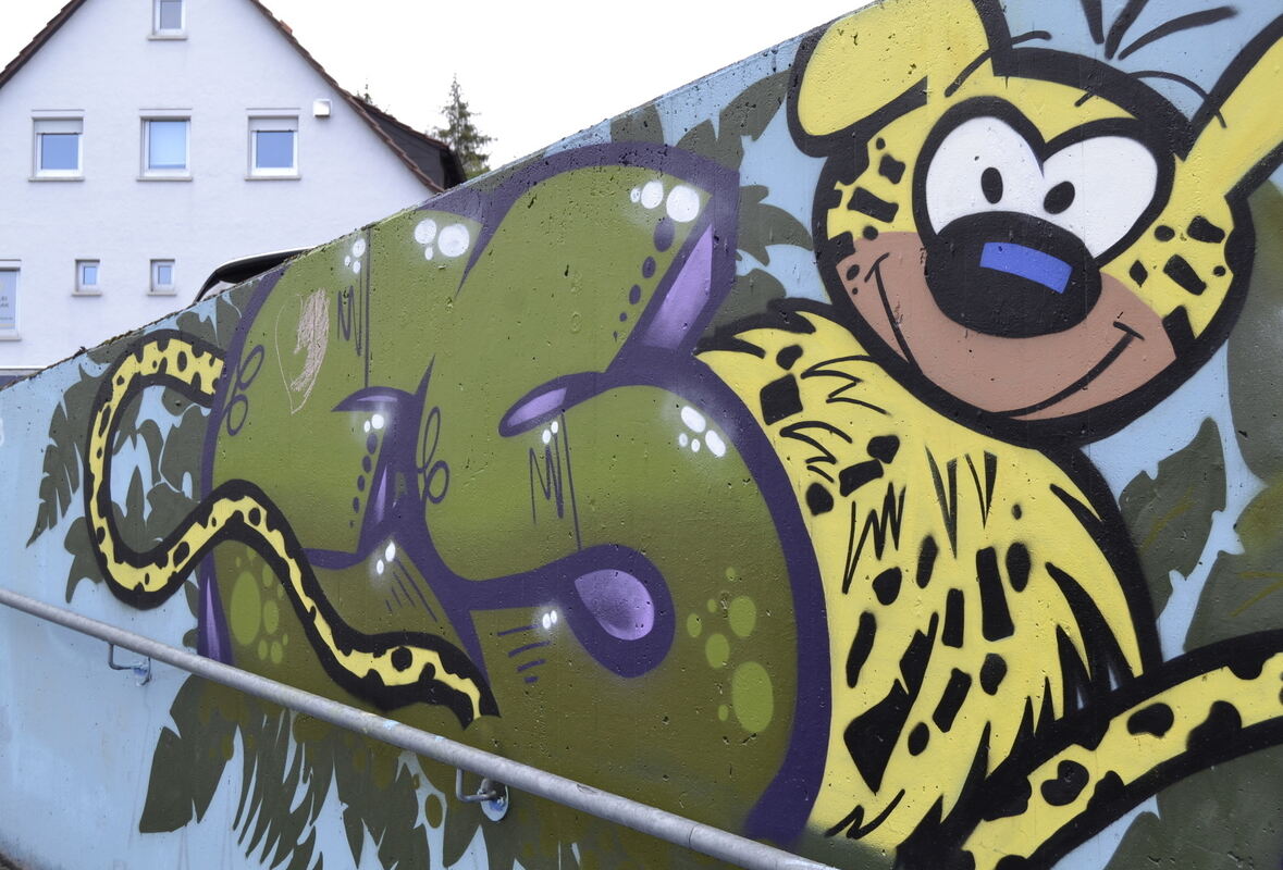 REUTLINGEN. Das Marsupilami: Dieses lustige Tier mit dem leopardenähnlichen Fell und dem acht Meter langen Schwanz ist der schier grenzenlosen Fantasie des belgischen Comic-Künstlers André Franquin entsprungen. Er legte auch gleichzeitig seinen Ursprung im Fantasieland Palumbien fest. Im Jahr 1952 wurde es in einem ersten Comicabenteuer im Dschungel von Palumbien entdeckt. Aber auf seinen zahlreichen Abenteuern fühlte sich das clevere Tier auf der ganzen Welt wohl. Jetzt ist es auch in Reutlingen aufgetaucht. Am Eingang zur Fußgängerunterführung an der Lerchenstraße, Ecke Konrad-Adenauer-Straße lächelt es alle an, die dort vorbeikommen.